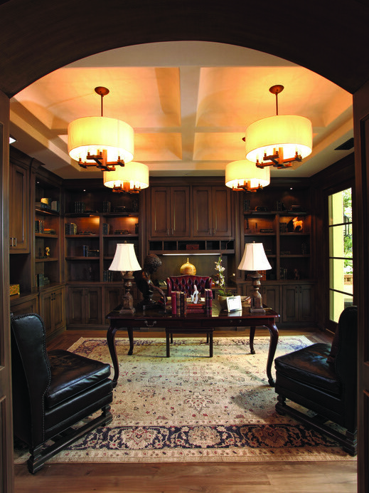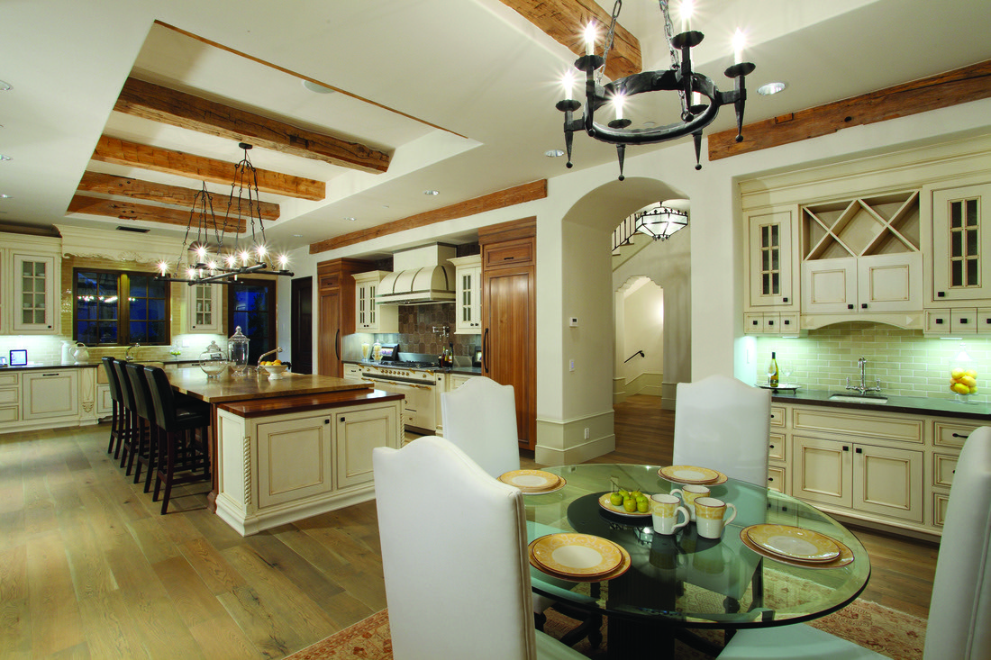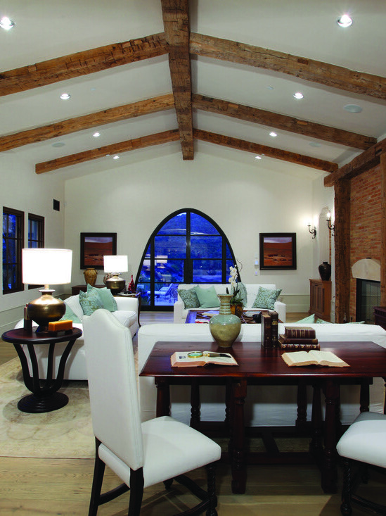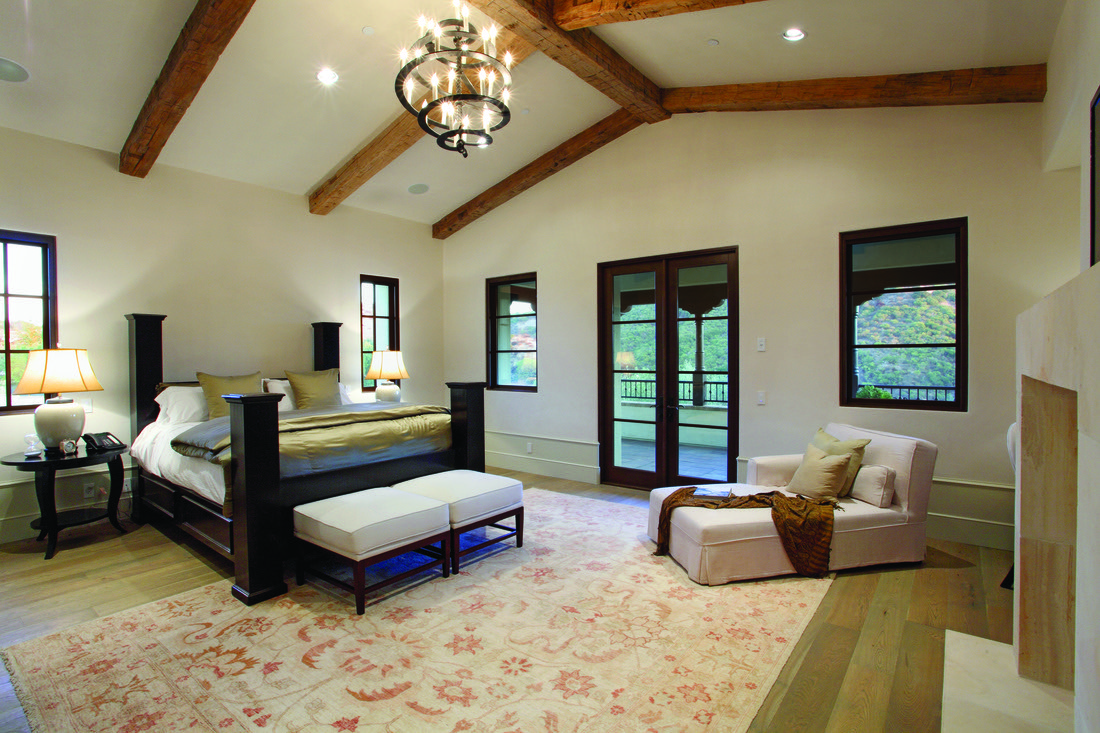 A home that exhibits quintessential Santa Barbara traits—white stucco exteriors, red tile roofs, and softly arched doorways and courtyards. Inside, exposed wood beam ceilings and rich, earth-toned accents—including detailed trim, doors, and fixtures—create a cozy, refined feel.